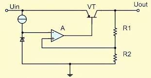Un portion de la tension de sortie prélevée avec le pont diviseur R1R2 est appliquée en entrée du comparateur A dont l'entrée négative est connectée à une référence de tension. Le comparateur contrôle le transistor pour asservir la tension de sortie à la valeur souhaitée.