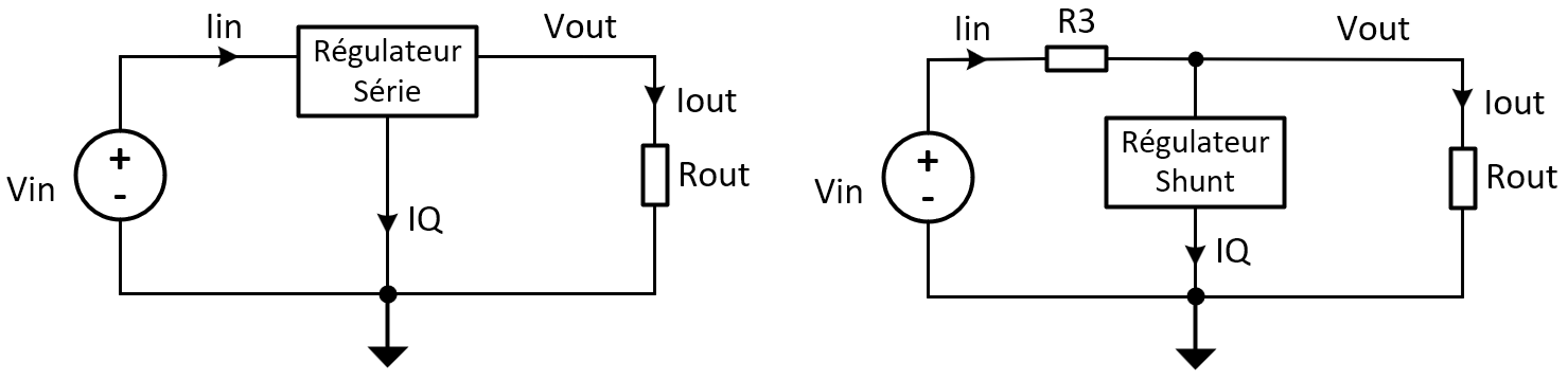On distingue 2 grandes familles d'alimentation linéaires : les régulateurs Shunt et les régulateurs Série.