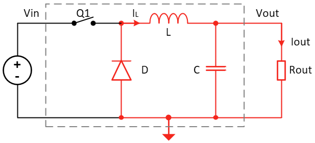 Pendant le première phase, l'interrupteur (transistor) est fermé, la diode est bloquée, le courant circule dans la branche principale, l'énergie est emmagasinée dans l'inductance.