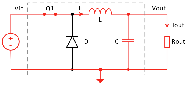 Dans cette topologie, les pertes sont dues principalement aux éléments parasites des composants (les résistances série de l'inductance et du transistor et de la diode.