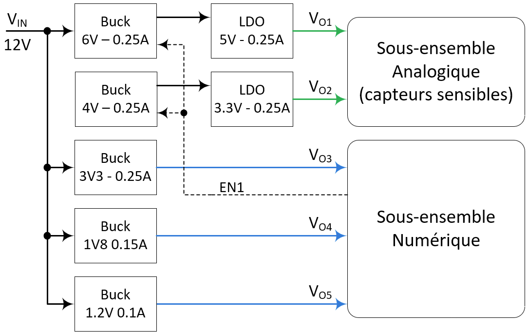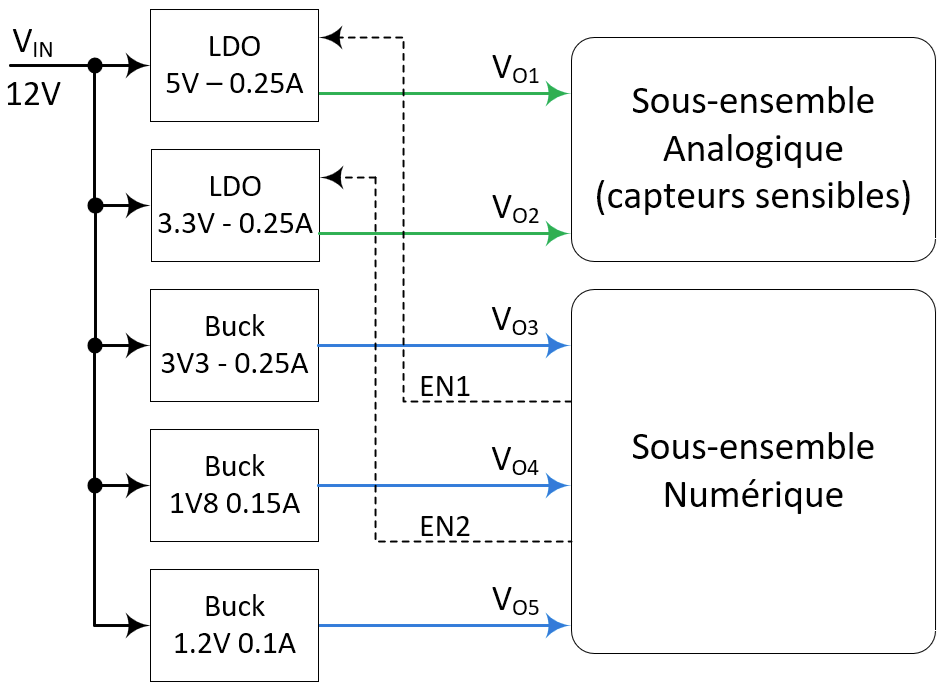 Dans la conception d'un système complet on a souvent besoin de générer différentes tension, pour des questions de rendement, on préfèrera les générer depuis la tension principale plutôt que de les chainer: