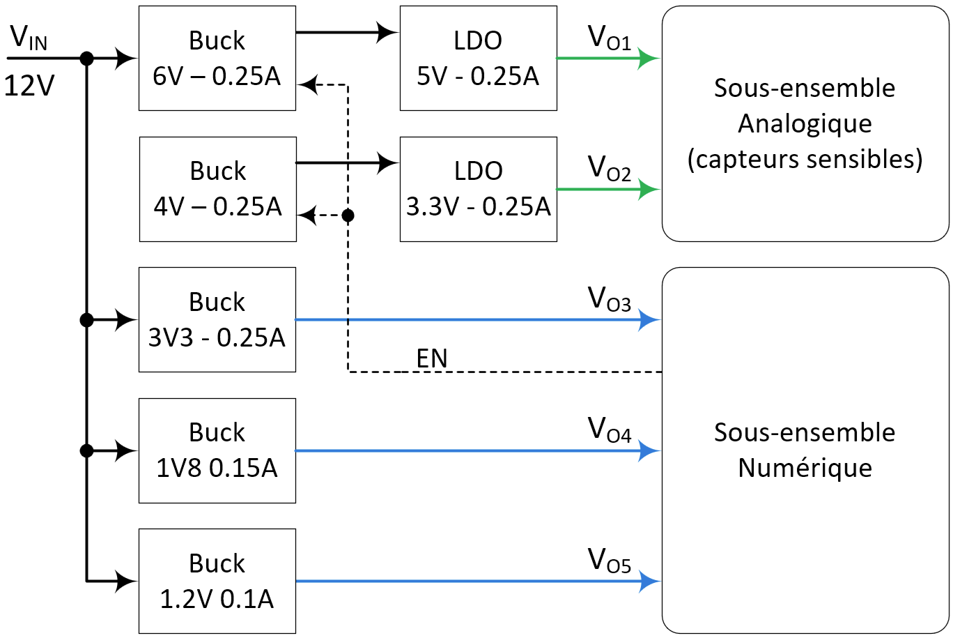 partie sensible de l'électronique nécessitant régulateur linéaire (LDO). Comme on peut le voir dans le chapitre sur le LDO, cette topologie n'est pas adaptée pour la génération d'une basse tension depuis une haute tension en raison des besoins de dissipation des pertes par effet joule. Dans ce cas deux solutions sont recommandées :